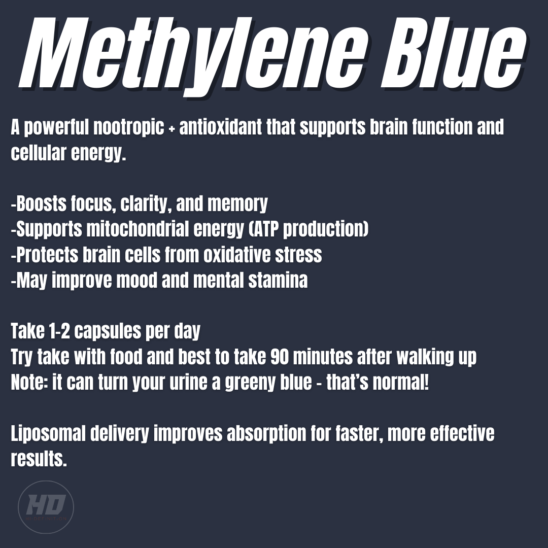 Liposomal Methylene Blue 20 mg Enhances mitochondrial energy (ATP), improves brain oxygenation, and supports neuroprotective function. Liposomal delivery improves absorption and cellular uptake.