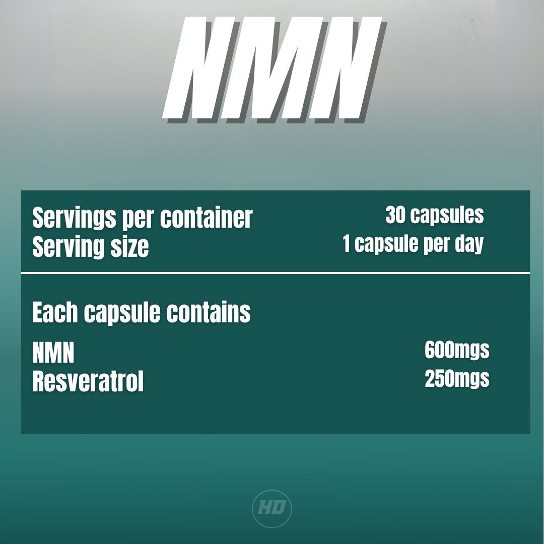 NMN (Nicotinamide Mononucleotide) 600 mg Precursor to NAD⁺, supports cellular energy, DNA repair, and healthy aging