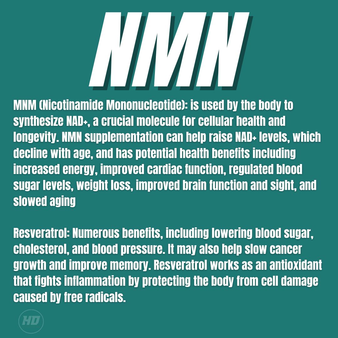 Together, NMN and Resveratrol are often taken synergistically to support mitochondrial function and promote healthy aging at the cellular level.